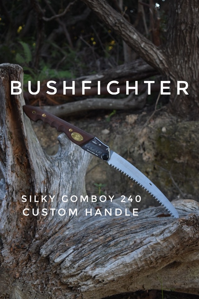 ブッシュファイター BUSHFIGHTER ※カスタムハンドルの組付け済み商品となります。 Silkyゴムボーイカーブ 荒目 240 本体4,630円(税込5,093円) +カスタムハンドル ※改造品の為ノコギリのメーカー保証は受けられません。 替え刃交換可能 Silky ゴムボーイカーブ 交換可能荒目 240 替刃 YAMAKEN氏が野営で愛用してきた鋸 Silky GOMBOY 240 荒目カーブ刃 この鋸を選ぶ理由 それは野営においてバランスの良い鋸だからだ。 ブッシュクラフトでも市販薪にも長すぎず短すぎない。 240の刃渡りは鋸を引く距離もパワフル。 より長く引ければ、それだけ前後の回数が減るのだ。 又、カーブ刃は鋸を木に押し付けなくても引くだけで刃が入っていく。 さらに荒目は歯の一本一本の刃が長く大きいため切削量が多く素早く切りたい野営用途に最適な刃だ。 さらにSilkyの作る日本製の刃は粘りがあって曲がったり折れたりしにくい。 刃にも鋸刃の通りを良くする特殊な技術が使われていおり、 ブレード全体を曲面研磨加工で刃厚よりも薄くすることで刃以外の抵抗を減らし異次元の切れ味を実現している。 日本歴史的なの林業と木造建築が生んだ伝統的な引いて切る鋸が世界的に評価されている事はは言うまでもない。 ○野営師の為に この素晴らしい日本製の技術が詰まった鋸を 敬意を込めて野営における実用性を高めるべく 我々独自の木製のカスタムハンドルの設計を行いました。 握り位置を後方に取り直す事で軽い力で刃を木に押し当てるモーメントを発生。 特徴的なフィンガーグルーブドは作業で握力が低下しても引く力とカーブ刃の食らいつく力だけで切り進める事を可能にしました。 〇ノコギリとしての使用用途を最大限に フィールドでの整地草刈りがしやすいカーブ刃とハンドル。 荒目の刃は調達した木の枝払いは鋸で1回引くだけで大半は落とせる。 刃の背中のエッジでファイヤースターターの着火が可能。 バックソーには無いコンパクトなボディは日本の森での作業に威力を発揮するでしょう。 野営での作業に差がつく切り心地を体感してもらいたい。 ■素材:木、真鍮、鉄(ノコギリ本体) 高級木(ウォールナット) ■サイズ 長さ:約300mm (収納時) 幅:約70mm 厚み:約25mm ■重量:約 g ■製造元:EVOLUTION MOUNTAIN ■製造国:日本 made in japan
